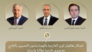 وزير الخارجية يتلقى اتصالين هاتفيين من وزيرى خارجية إيطاليا وإسبانيا لمتابعة التطورات المتسارعة بالشرق الأوسط كتبت فاطمه منصور تلقى د.…