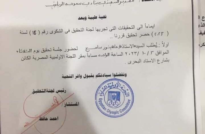 قررت اللجنة الأولمبية استدعاء الثنائى أشرف مختار عضو مجلس إدارة نادى سموحه فوق السن والدكتورة ماهينور سامح عضو المجلس تحت السن للتحقيق .