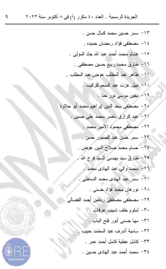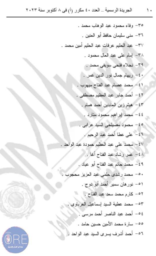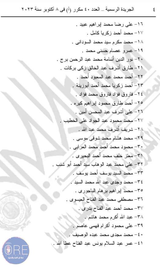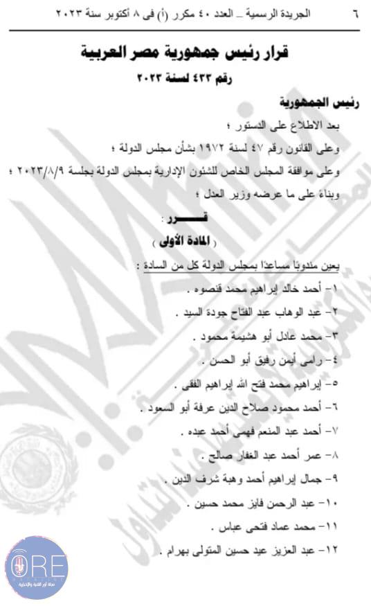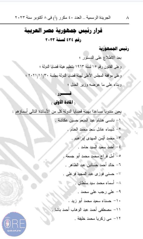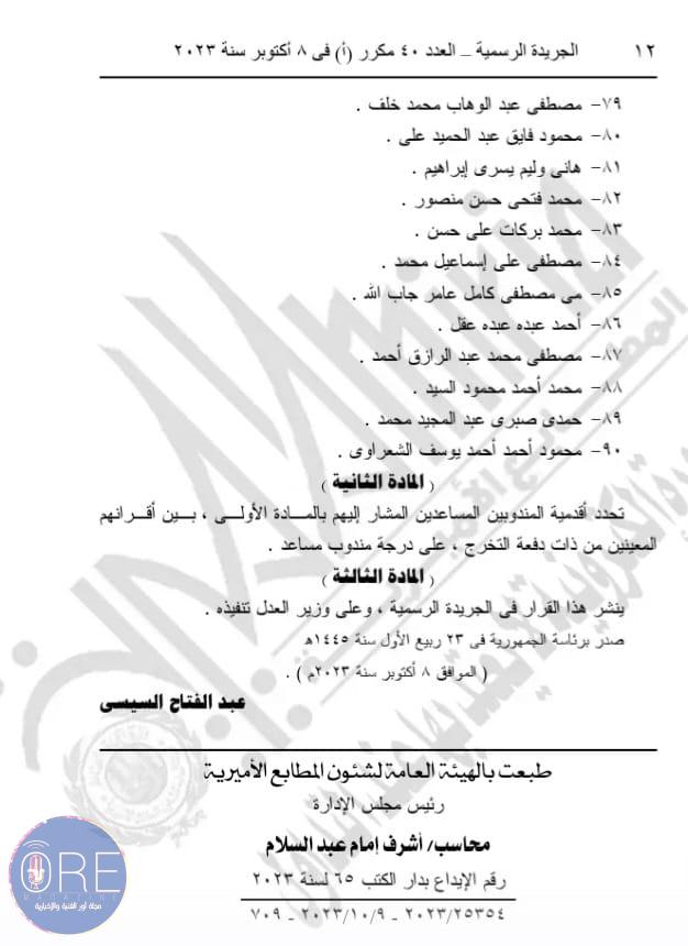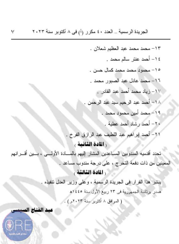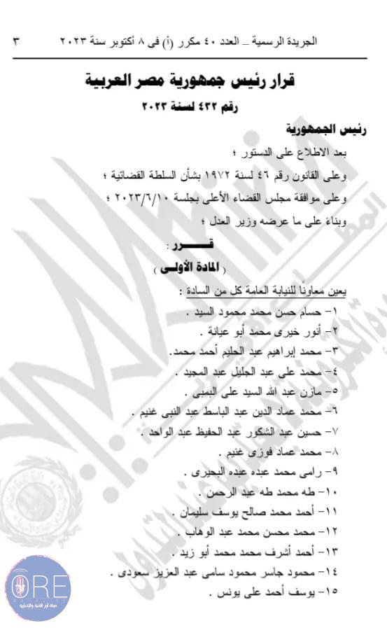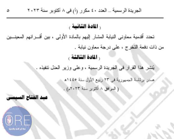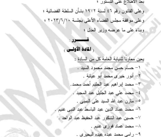 وينص القرار الأول رقم 432 لسنة 2023 على تعيين 41 شخصا في منصب معاون للنيابة العامة