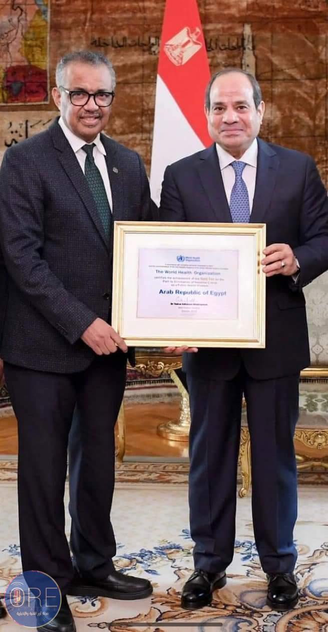 مدير عام منظمة الصحة العالمية “تيدروس أدهانوم” سلّم الرئيس #السيسي اليوم شهادة المستوى الذهبي على مسار القضاء على فيروس “سي” في #مصر 🇪🇬، مقدماً التهنئة لمصر وموضحاً أنها أصبحت الدولة الأولى في العالم التي تحصل على هذا الإشهاد، بعد تحقيقها، في زمن قياسي