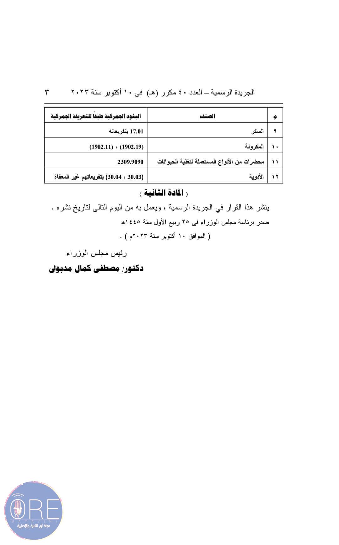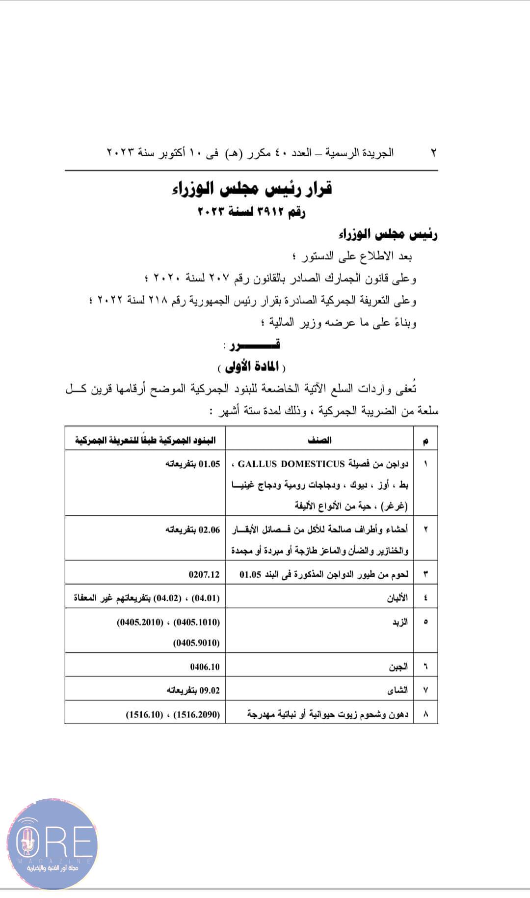 قرار رئيس مجلس الوزراء بعفو واردات السلع من الضريبة الجمركية.