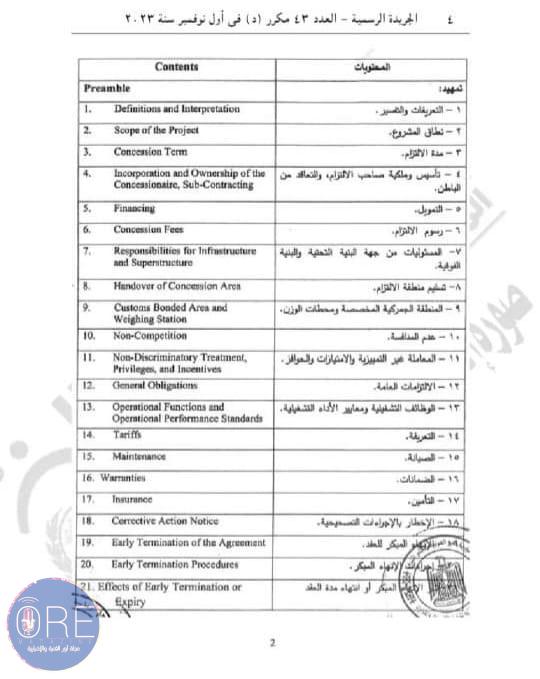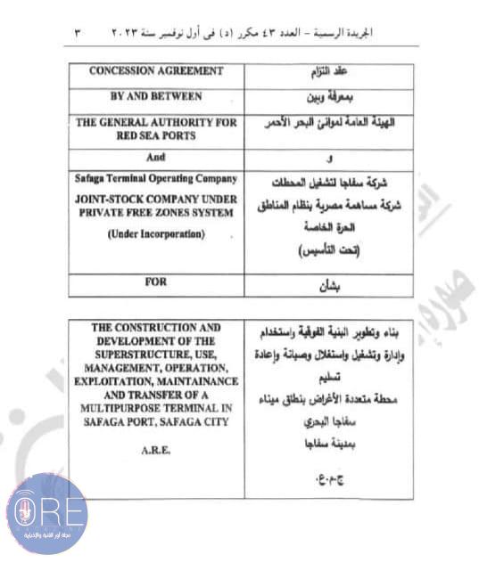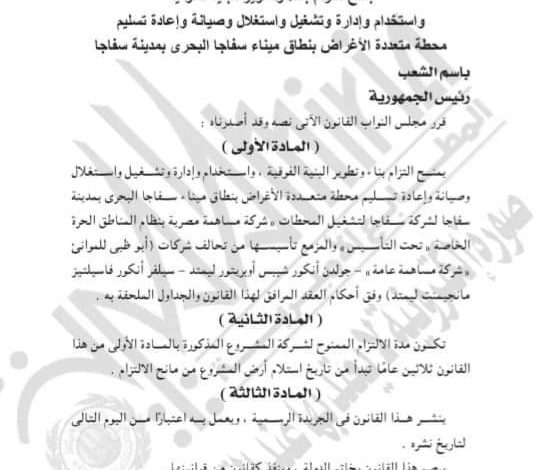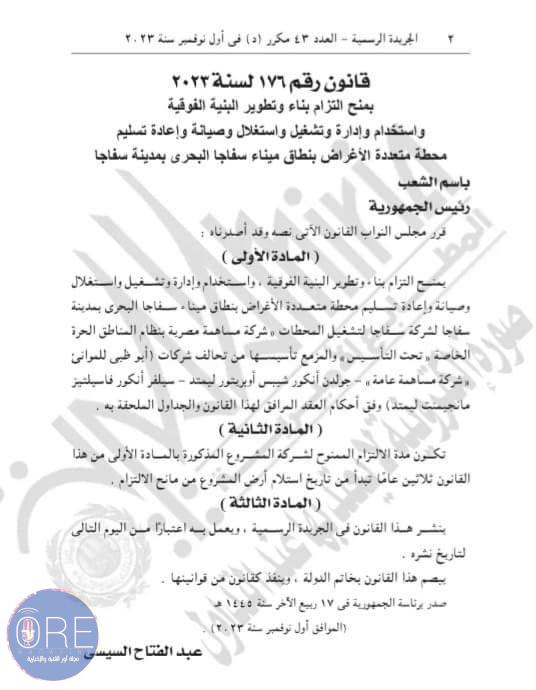 صدّق الرئيس عبد الفتاح السيسى على القانون رقم 176 لسنة 2023 بمنح التزام بناء وتطوير البنية الفوقية واستخدام وإدارة وتشغيل واستغلال وصيانة وإعادة تسليم محطة متعددة الاغراض بنطاق ميناء سفاجا البحري بمدينة سفاجا لشركة سفاجا لتشغيل المحطات”شركة مساهمة مصرية بنظام المناطق الحرة الخاصة – تحت التأسيس- والمزمع تأسيسها من تحالف شركات (أبو ظبى للموانئ “شركة مساهمة عامة”- جولدن أنكور شيبس أوبريتور ليمتد- سيلفر أنكور فاسيلتيز مانجيمنت ليمتد).