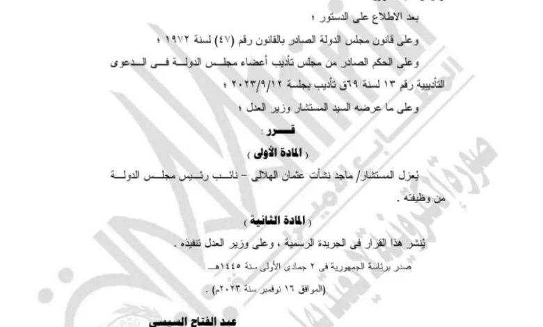 نشرت الجريدة الرسمية قرارًا للرئيس عبد الفتاح السيسى، يحمل رقم 536 لسنة 2023 بعزل المستشار ماجد نشأت عثمان الهلالى، نائب رئيس مجلس الدولة من وظيفته.
