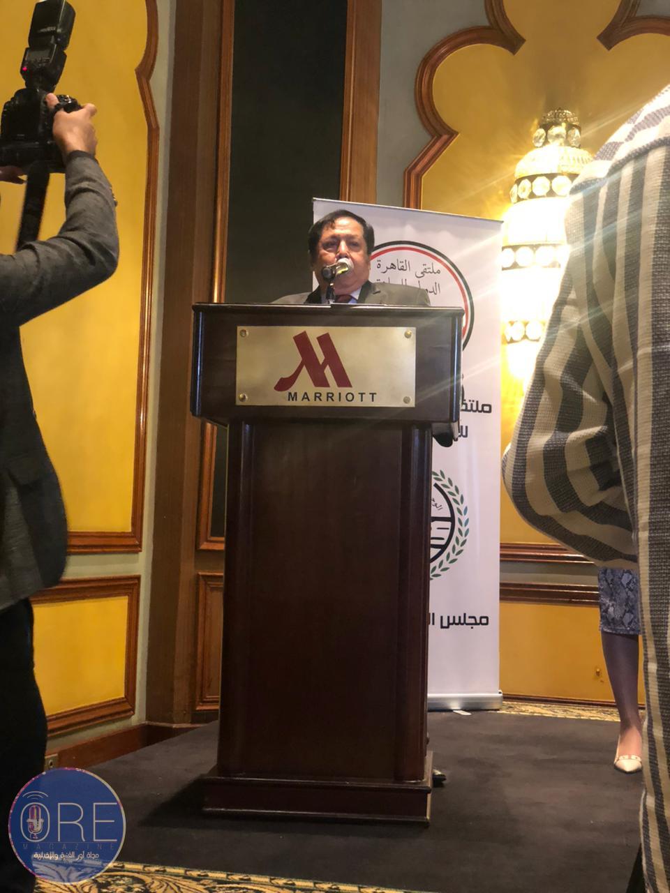 – السيد السفيرتاج الدين بن عمر رسلاتى – مفوض مجلس دول شمال أفريقيا يتحدث فى محور الدبلوماسية وعلاقتها بالريادة.