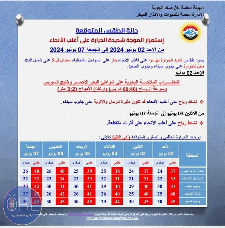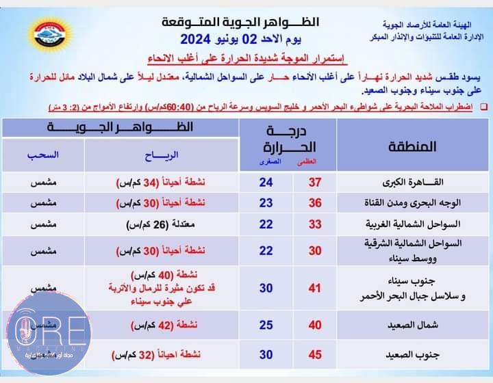 حالة الطقس على كافة أنحاء الجمهورية ليوم الأحد الموافق 2يونيو لسنة 2024