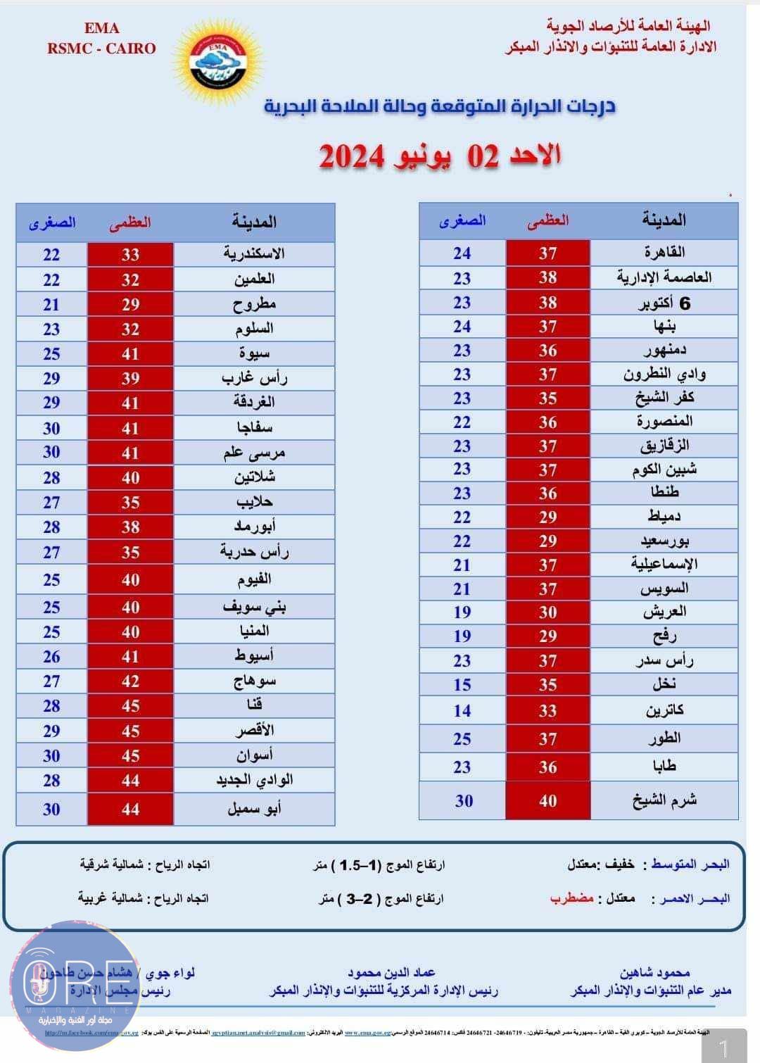 تستعرض مجموعة أور الإعلامية درجات الحرارة اليوم طبقاً لما أصدرته هيئة الأرصاد الجوية المصرية بالمحافظات التاليه