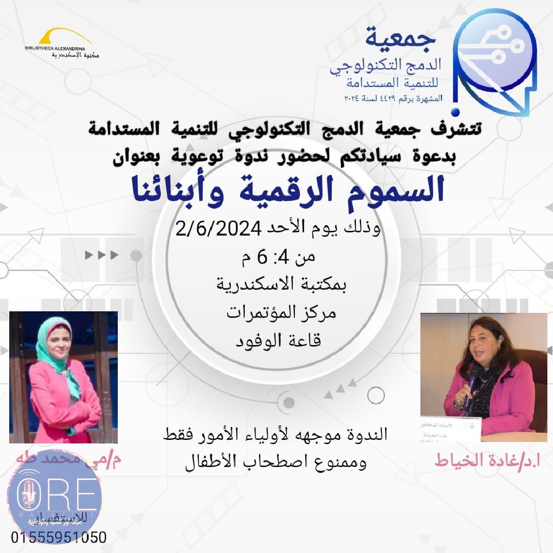 نظمت جمعية الدمج التكنولوجي للتنمية المستدامة بالتعاون مع مكتبة الإسكندرية من خلال إدارة خدمات المكتبات المتخصصة بقطاع المكتبات محاضرة بعنوان ” السموم الرقمية وابناؤنا” وذلك في إطار سلسلة ندوات تحت شعار ” معا لخلق جيل سليم ” وذلك بقاعة الوفود بمركز المؤتمرات بمكتبة الإسكندرية