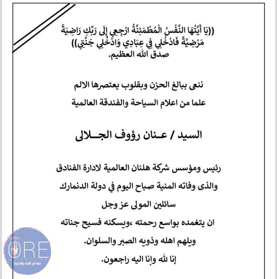 تنعي مجموعة أور الإعلامية برئاسة الإعلامية الدكتورة نشوى فوزي رئيس مجلس الإدارة والدكتور مايكل صفوت نائب رئيس مجلس الإدارة والأستاذة شيرين عبده رئيس لجنة العلاقات العامة بالمجموعة وجميع أعضاء المجموعة وفاة رجل الأعمال و السياحه العالمى السيد/ عنان رؤؤف الجبالي – صاحب مجموعة فنادق هلنان العالميه ألذى وافته المنيه صباح اليوم فى دوله الدنمارك داعين الله ان يتغمده بواسع رحمته ويسكنه فسيح جناته ويلهم اهله وذويه الصبر والسلوان