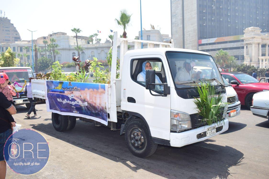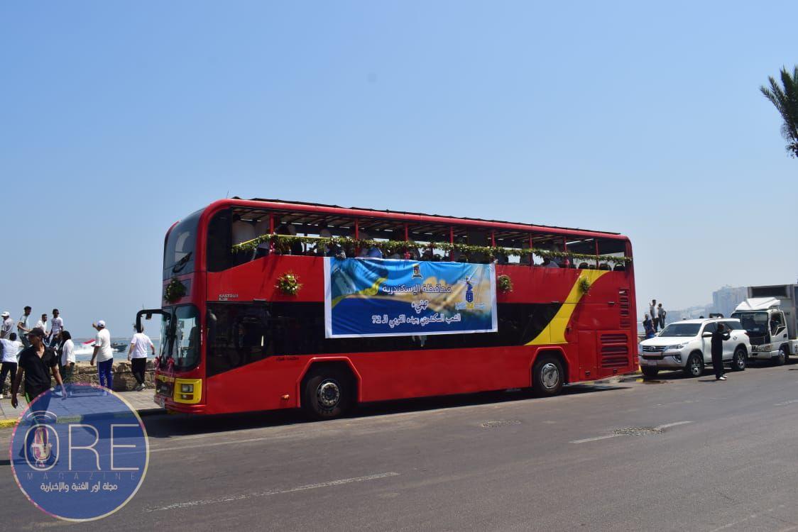 ورافق الموكب اتوبيسات اسكندرية السياحية مزينة بالورود