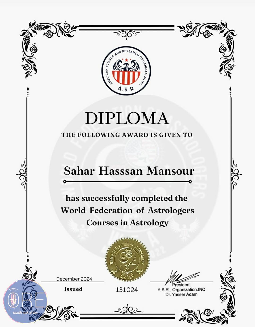 تهنئة خاصة بحصول الباحثة الفلكية سحر منصور على دبلومة الاسترولوجى من المنظمه الامريكيه للعلوم والأبحاث .A.S.R