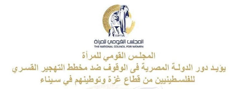 أعلن المجلس القومي للمرأة برئاسة المستشارة أمل عمار وجميع عضواته وأعضائه ولجانه الدائمة وأمانته الفنية وفروعه بجميع محافظات الجمهورية، وباسم نساء مصر دعمه الكامل لجميع الإجراءات التى تتخذها الدولة المصرية الكفيلة بحماية الأمن القومي المصري والعربي، والوقوف ضد مخطط التهجير القسري للفلسطينيين من قطاع غزة وتوطينهم في سيناء، ويؤكد أن ذلك يعد تصفية وانهاء للقضية الفلسطينية التي هي قضية الوطن العربي بأكمله، ويشدد على أن الأمن القومي المصري وسيناء خط أحمر، ولا تهاون في ذلك.