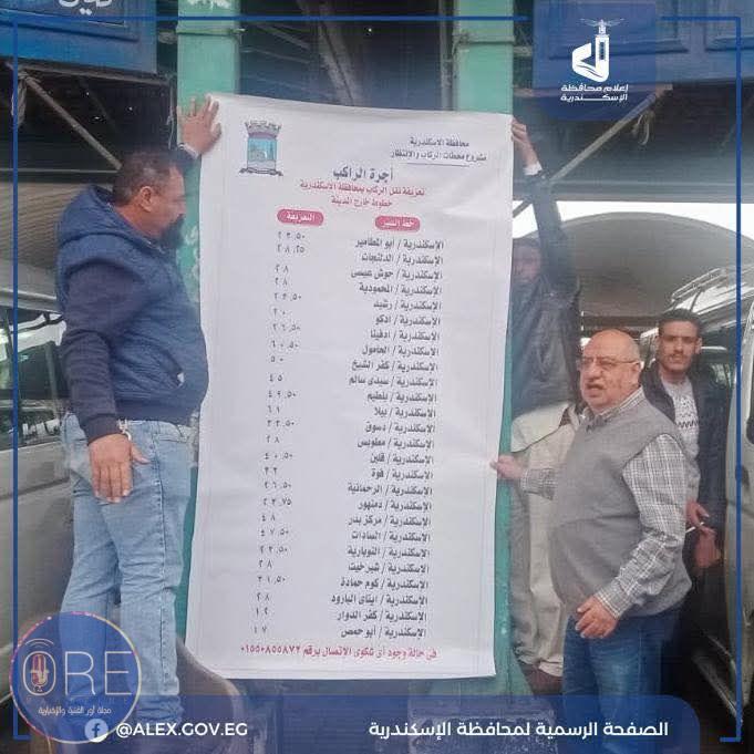 و تنفيذاً لتوجيهات محافظ الإسكندرية بهذا الشأن قامت إدارة المواقف منذ اعتماد تسعيرة الركوب الجديدة بوضع بنرات توضح خطوط السير وسعر تعريفة الركوب في كل خط وذلك المواقف الرئيسية بنطاق المحافظة وهي (موقف ميدان الشهداء “بمحطة مصر- موقف الكيلو ٢١- موقف العوايد- موقف العامرية- موقف بسيون أبو سليمان- موقف المنشية- الموقف الجديد)