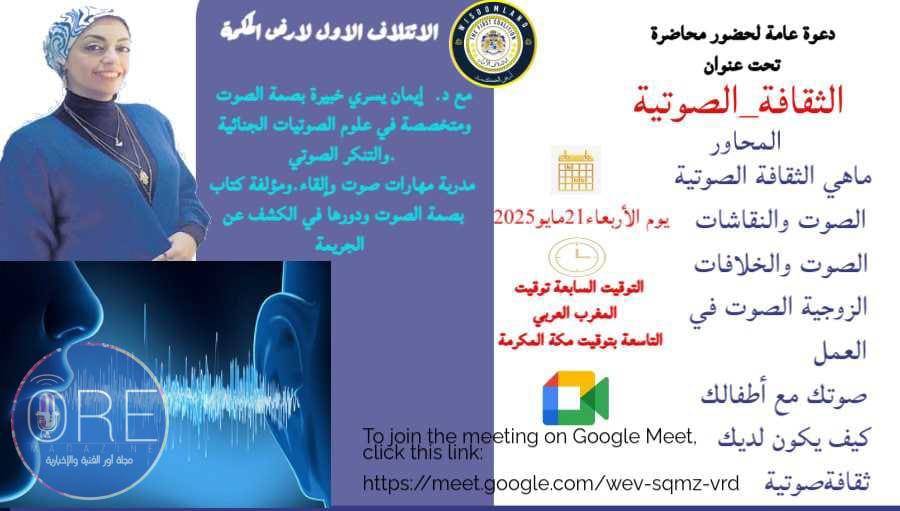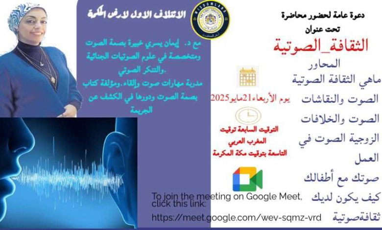 ولذلك فقد أقامت مملكة أرض الحكمة، ندوة ثقافية بعنوان “الثقافة الصوتية” والتي حاضر فيها دكتورة إيمان يسري، خبيرة بصمة الصوت ومتخصصة في علوم الصوتيات الجنائية والتنكر الصوتي ومؤلفة كتاب “بصمة الصوت ودورها في الكشف عن الجريمة”. وأدار الندوة دكتورة لميس الرفاعي بوزارة حقوق الإنسان بائتلاف مملكة أرض الحكمة.
