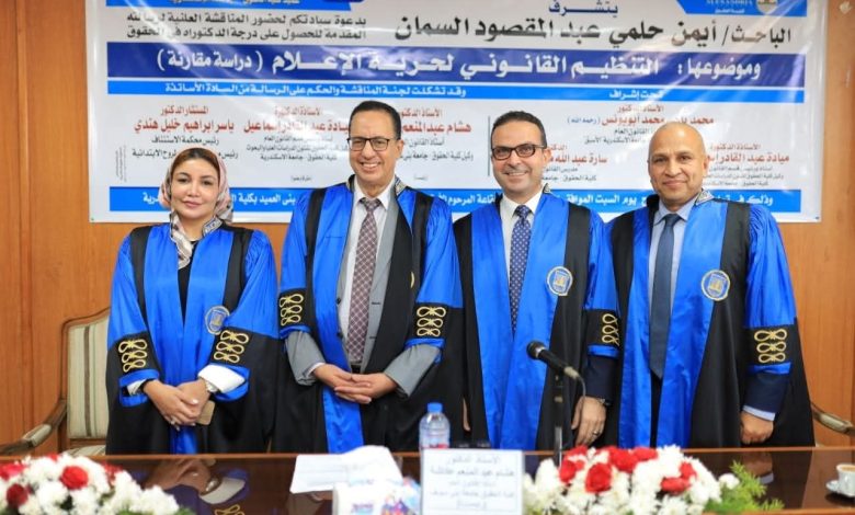 حصل الباحث اللواء أيمن حلمي عبد المقصود السمان، مساعد رئيس شركة الإسكندرية للصيانة البترولية «بترومنت» للأمن، على درجة الدكتوراة فى القانون من جامعة الإسكندرية، وذلك عن الرسالة المقدمة من الباحث تحت عنوان ” التنظيم القانوني لحرية الاعلام”