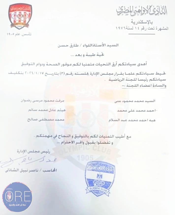 تهنئة خاصة إلى اللواء طارق حسن بتوليه رئاسة اللجنة الرياضية لنادي الأوليمبي