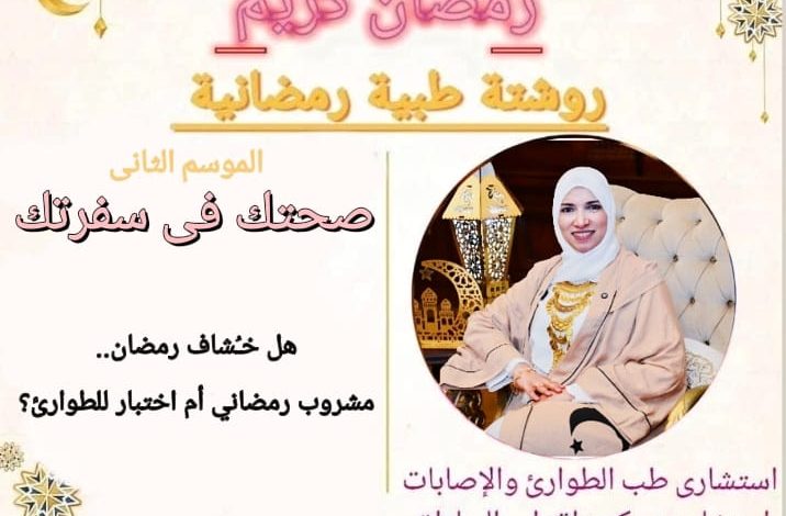 مبادرة روشتة رمضانية الموسم الثانى تحت عنوان *صحتك فى سفرتك* لعرض يومى ل 30 صنف مشهور على سفرتك فى رمضان لمعرفة تأثيره و الخرافات عنه و المخاطر الصحية منه، لتفادى الأزمات الصحية فى رمضان.