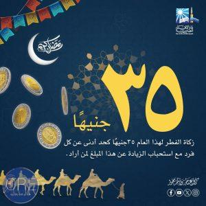 حدَّدت دار الإفتاء المصرية قيمةَ زكاة الفطر لهذا العام [1447هـ- 2026م] بـ (35 جنيهًا) كحدٍّ أدنى عن كل فرد، موضحة أن تقدير قيمة زكاة الفطر لهذا العام، جاء بالتنسيق مع مجمع البحوث الإسلامية بالأزهر الشريف.