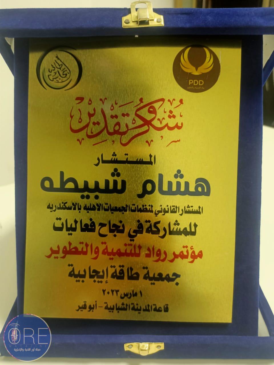 كرم اليوم مجلس إدارة جمعية طاقة ايجابية برئاسة الأستاذ/ محمد عبد العزيز المستشار هشام شبيطه المستشار القانوني لمجموعة شبكة أور الاعلامية وعضو اللجنة القانونية للاتحاد الإقليمي للجمعيات والمؤسسات الاهلية بالاسكندرية وذلك في مكتب سيادته اليوم لمشاركتة في نجاح مؤتمر رواد للتنمية والتطوير منسق اكبر سيمينار عمل للشباب السكندري والذي انعقد في المدينة الشبابية بابي قير اول شهر مارس الحالي وجاري التنسيق حاليا مع الجهات المعنية المختصة لعمل اكبرفاعلية للعمل الأهلي يشارك فيها الشباب السكندري ومجموعة من الجمعيات والمؤسسات الاهلية دعما للتحالف الوطني للعمل الأهلي التنموي تحت رعاية وتوجيهات القيادة السياسية