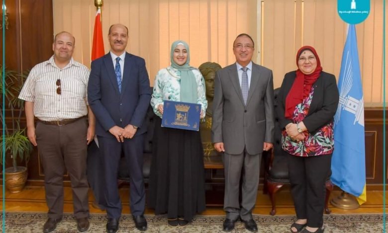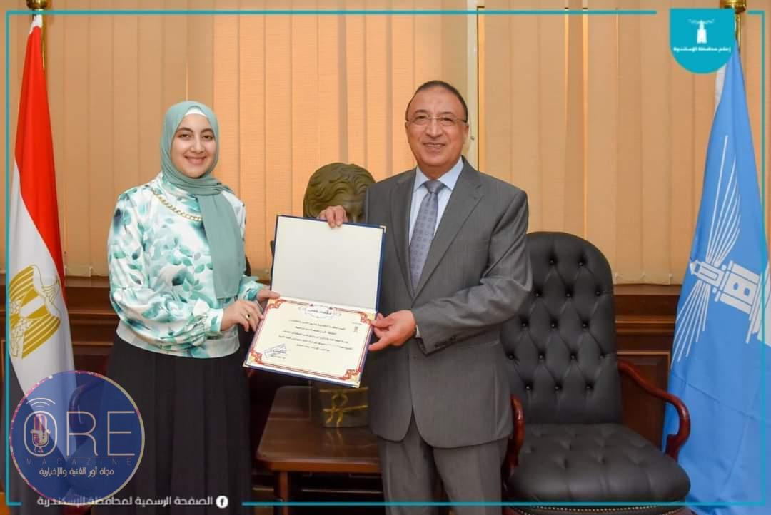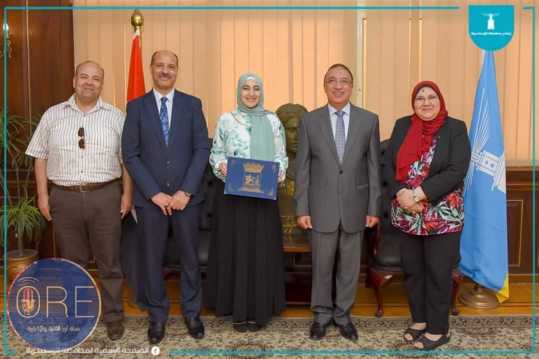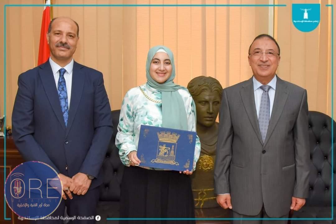 محافظ الإسكندرية يستقبل الطالبة فرح محمد قدرى إبراهيم حسن بنت محافظة الإسكندرية الحاصلة على المركز الثالث في الثانوية العامة