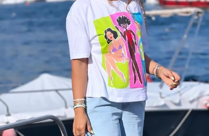 حيث تألقت “منه” بأحدث إطلالة جذابة حيث أرتدت تيشرت بالون الأبيض المرسوم والمتلون بألوان الصيف ونسقت معه بنطال جينز ازرق أبرز رشاقة جسمها وأختارت حقيبة متناسق لونها مع البنطال زرقاء اللون ، ووضعت مكياج ناعم ليبرز جمال وجهها وكحلت عينيها لتبرز جمالهم ووضعت أحمر الشفاه لتبرز جمال ضحكتها .