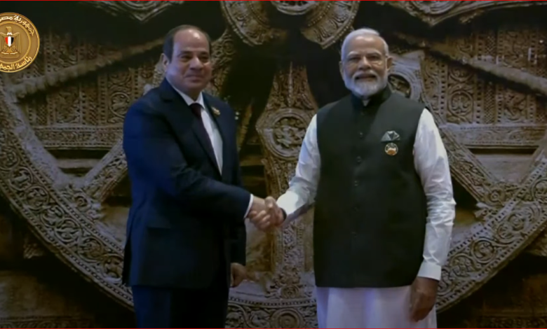 كما أتوجه بالتهنئة للهند على الهبوط الناجح على القمر، وأعرب أيضاً عن ترحيب مصر بالانضمام المستحق للاتحاد الأفريقي إلى عضوية المجموعة.