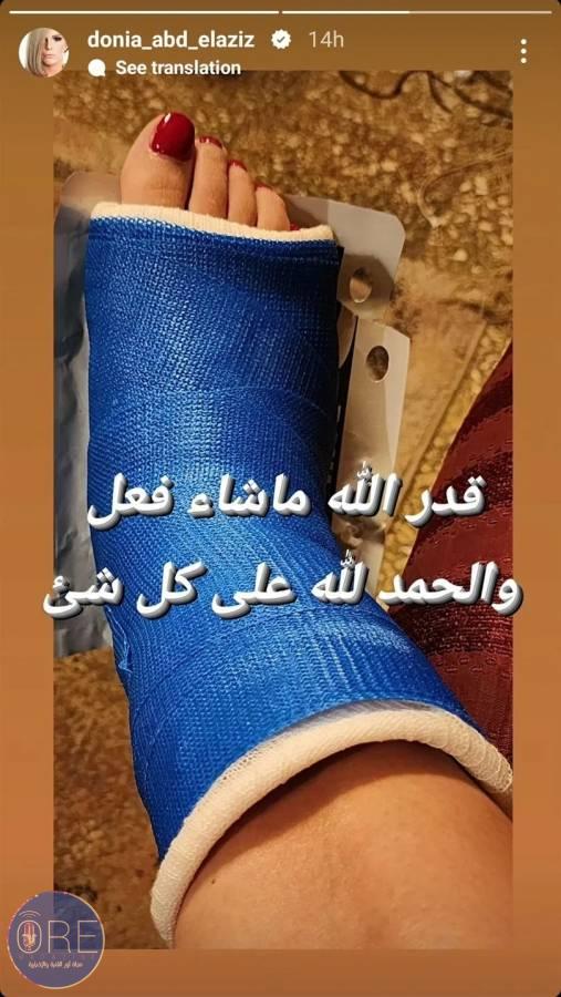 نشرت الفنانة المصرية “دنيا عبد العزيز” عبر حسابها الرسمى الخاص “إنستجرام” صورة أعلنت فيها عن إصابتها بكسر فى القدم، ونشرت صورة لقدمها وهي موضوعة فى جبيرة من الجبس، قائلة : “قدّر الله وما شاء فعل والحمد لله على كل شيء”.
