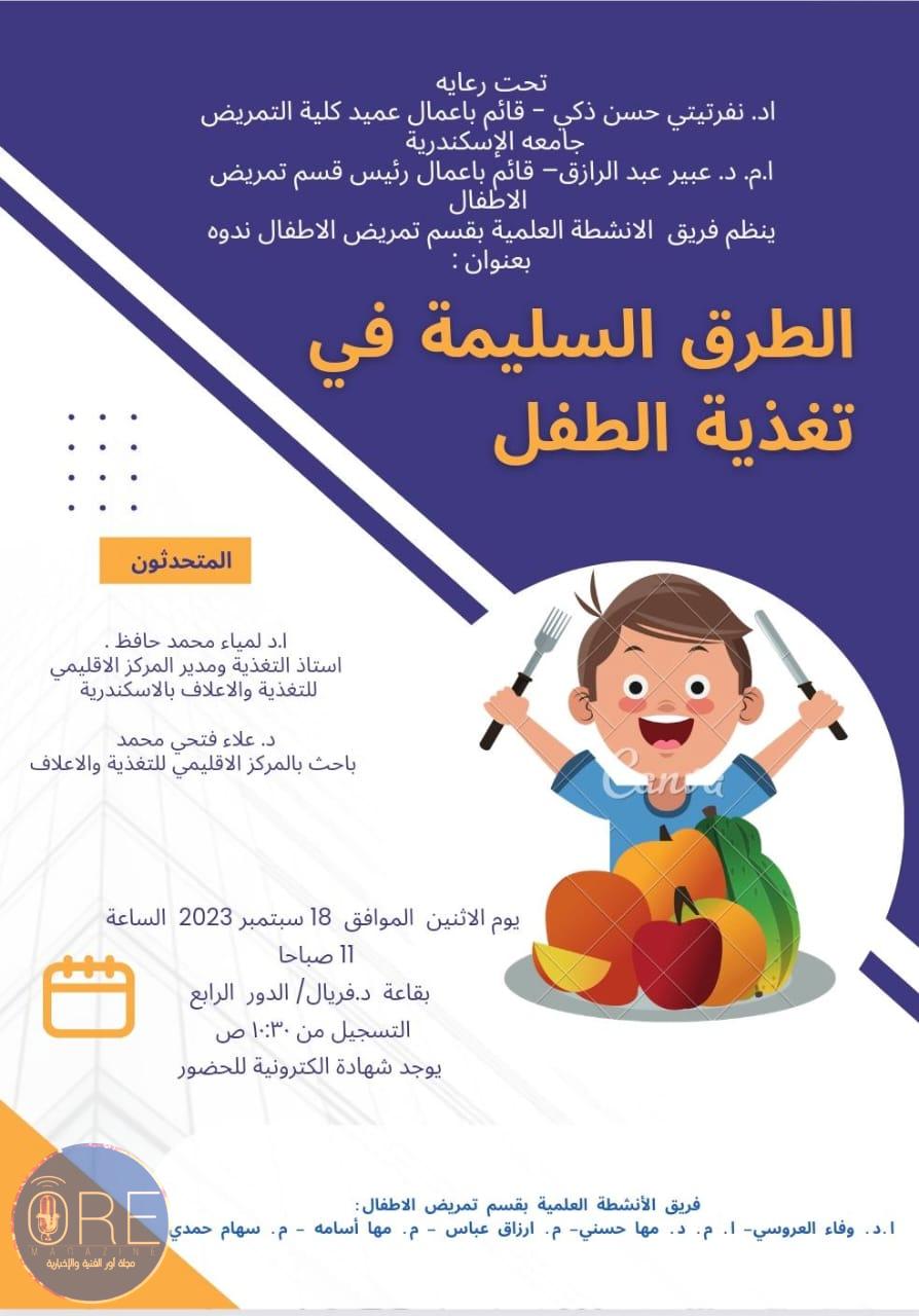 برعاية الأستاذة الدكتورة/ نفرتيتي حسن زكي القائم بتسيير أعمال العميد، الأستاذ الدكتور/ حنان حسني الشربيني وكيل الكلية لشئون التعليم والطلاب. بدعوة كريمة من فريق الأنشطة العلمية بقسم تمريض الأطفال، برعاية الأستاذ مساعد دكتورة/ عبير عبد الرازق القائم باعمال رئيس قسم تمريض الأطفال، الأستاذ الدكتور /وفاء العروسي بالتعاون مع المركز الاقليمي للأغذية والاعلاف بالاسكندرية بعمل ندوة تثقيفية عن( الطرق السليمة في تغذية الطفل وسلامة الغذاء في رحلته من السوق الي المنزل) وحاضر فيها الاستاذ الدكتورة/ لمياء حافظ استاذ التغذية ورئيس فرع المركز بالاسكندرية.